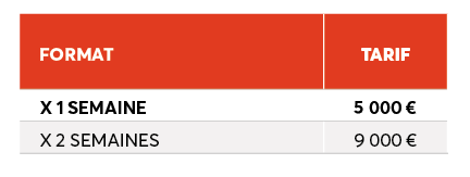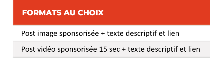 Le dispositif est limité à une annonce par semaine. Le format est composé d'une accroche de texte, d'un visuel, avec le lien de redirection de votre choix.