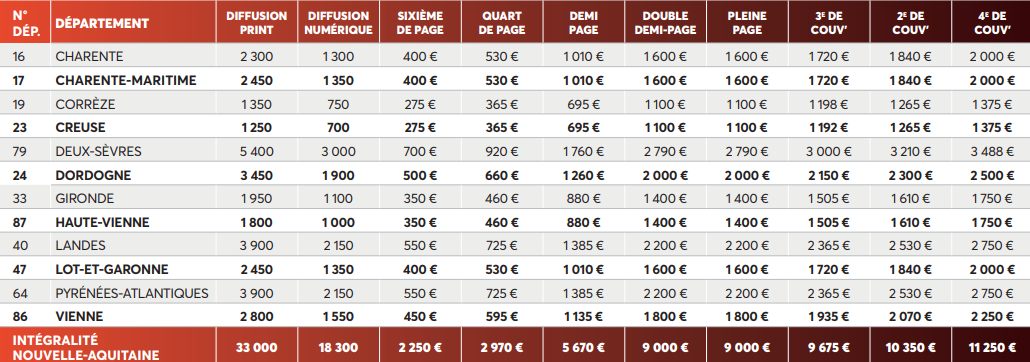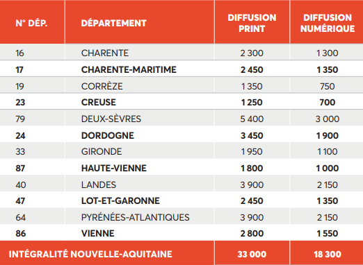 Le Supplément Nouvelle-Aquitaine est composé d'une édition premium par département de 44 pages diffusée par voie postale, avec un envoi simultané sous format de liseuse numérique et de fiches articles.